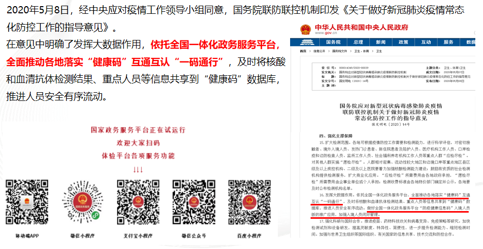 在意見中明確了發(fā)揮大數(shù)據(jù)作用,依托全國一體化政務(wù)服務(wù)平臺,全面推動各地落實(shí)“健康碼”互通互認(rèn)“一碼通行”,及時將核酸和血清抗體檢測結(jié)果、重點(diǎn)人員等信息共享到“健康碼”數(shù)據(jù)庫,推進(jìn)人員安全有序流動。